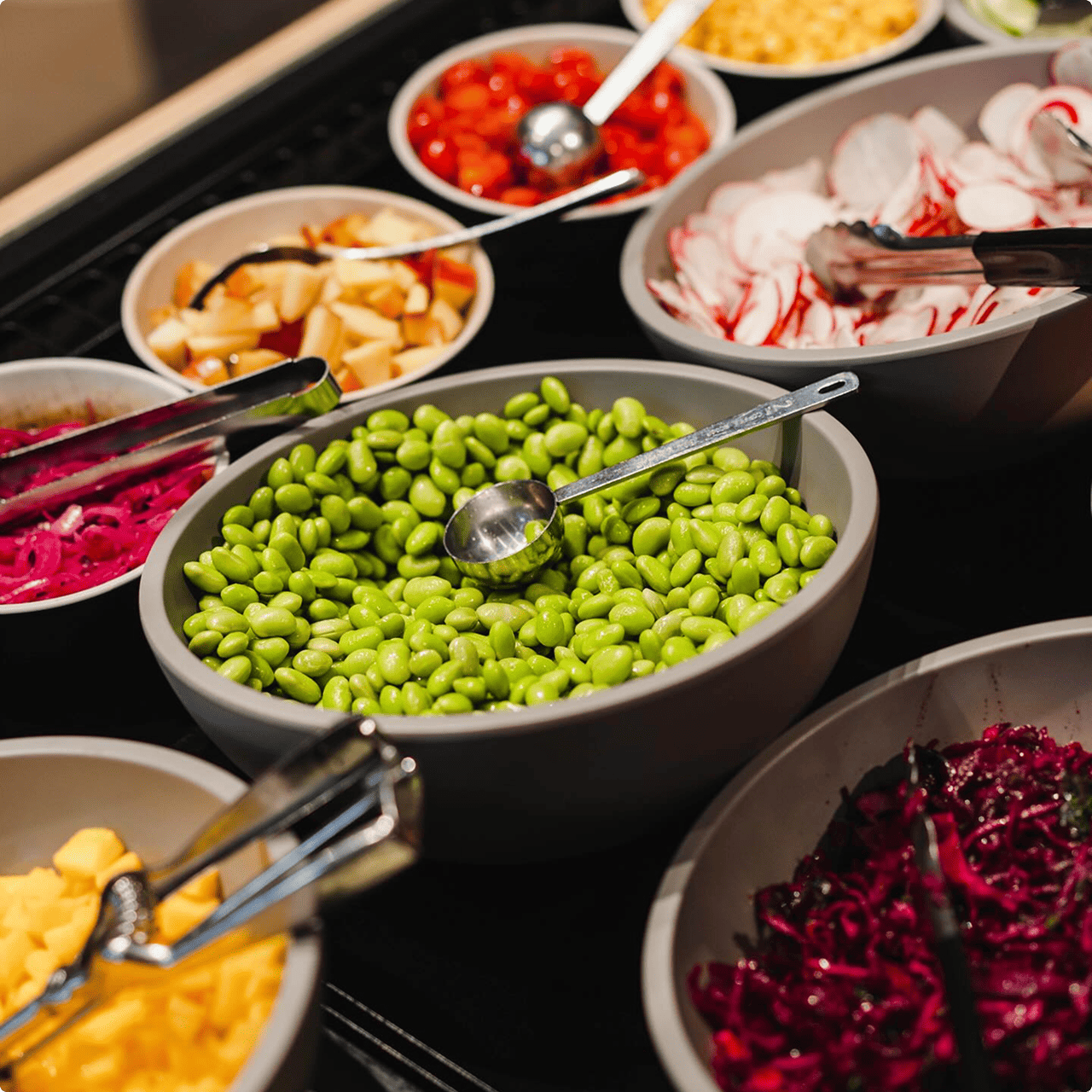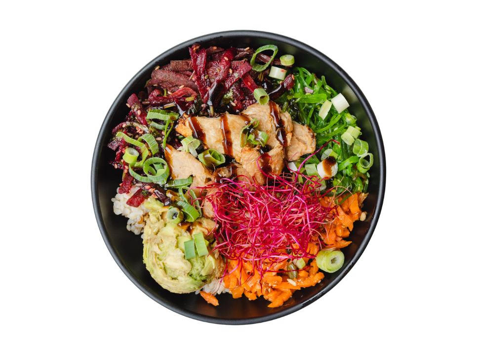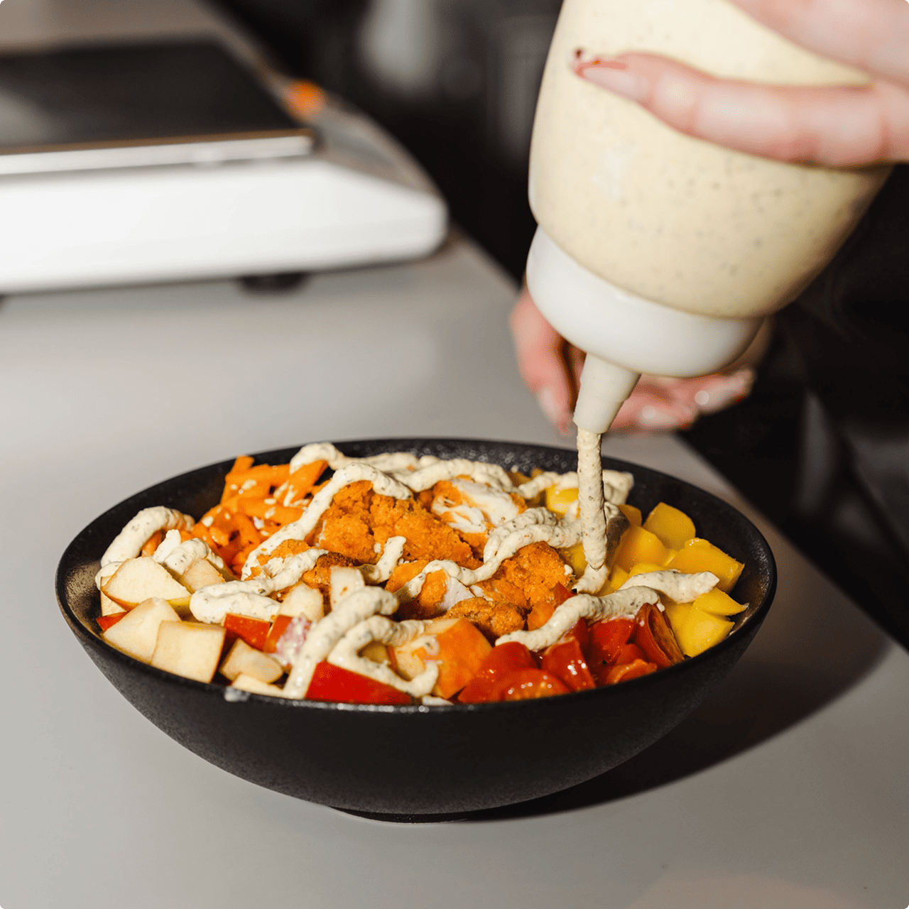 Laissez libre cours à vos envies et construisez le bowl qui vous ressemble en cinq étapes. Commencez par une base, relevez le tout d’une sauce, ajoutez des fruits et légumes colorés, complétez avec une protéine et terminez par la touche finale des toppings.