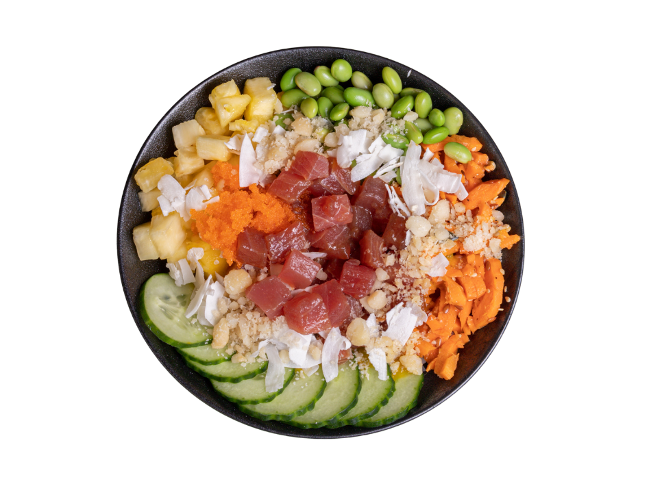 Toppings : Copeaux de noix de coco, masago (œufs de poisson), noix de macadamia