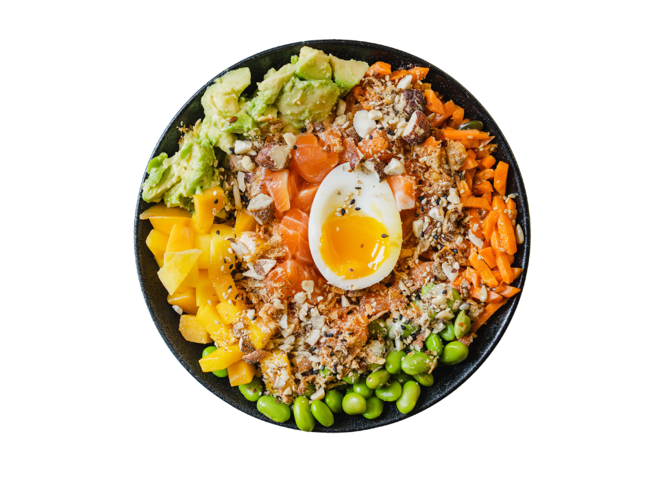 Protéine : Saumon supérieur (mariné) + ½ oeuf bio (mollet)