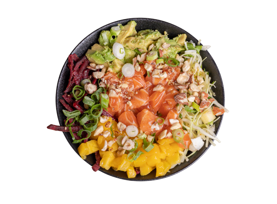 Riz blanc, saumon supérieur (mariné), concombre, mangue, radis, carottes, sauce classique, furikake, oignons jeunes